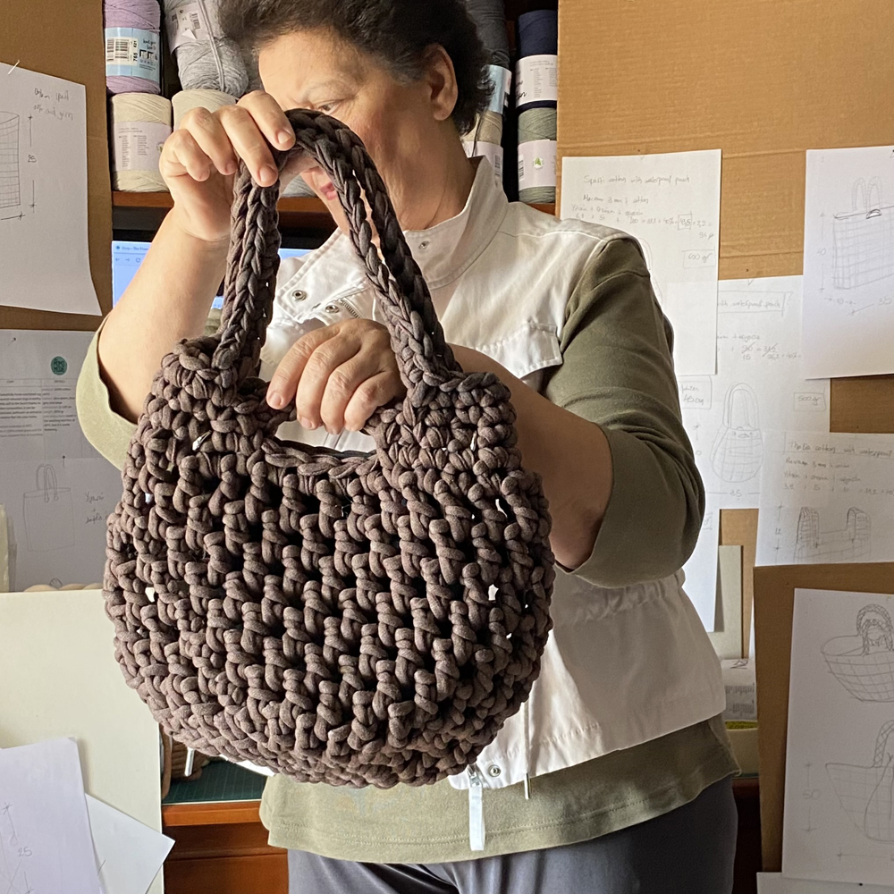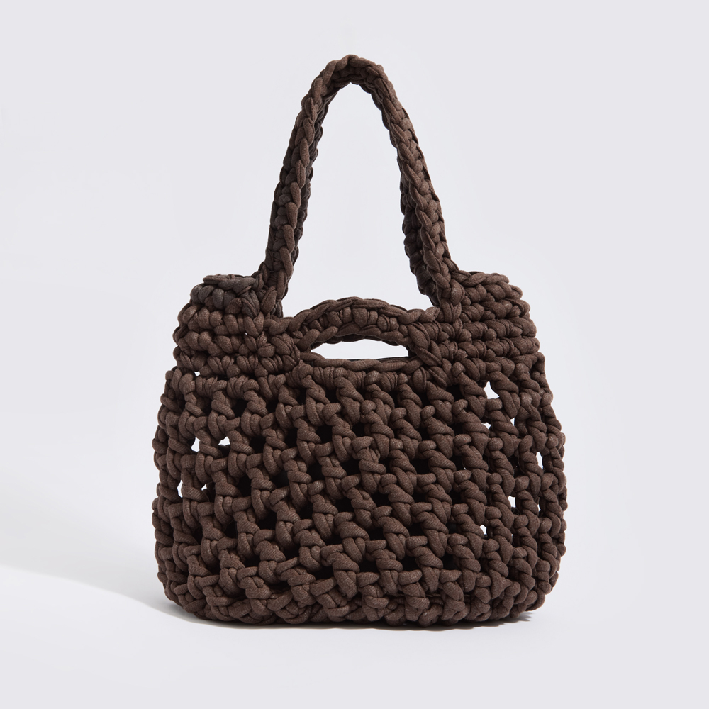 This tote bag is crafted from our signature cotton squashy yarn in 10 colours. Its sculptural pear shape and extra pair of short handles make it super functional for every day use . Stow essentials like your phone and cardholder in the waterproof pouch.
