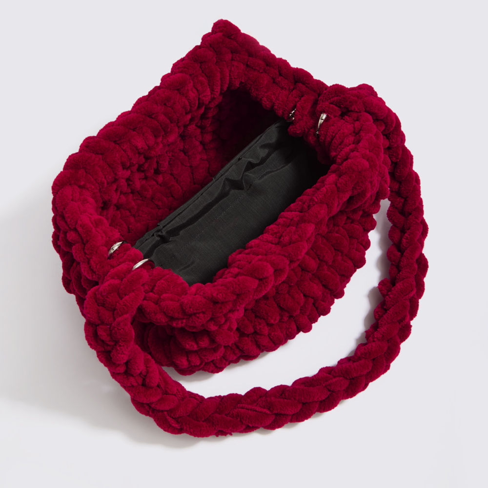Made in our Athens workshop from ultra soft velour yarn, this handbag has a slouchy shape with a structured frame and sizable interior to fit your wallet, glasses and phone. Use the waterproof pouch for extra protection. It comes with a matching, removable shoulder strap.