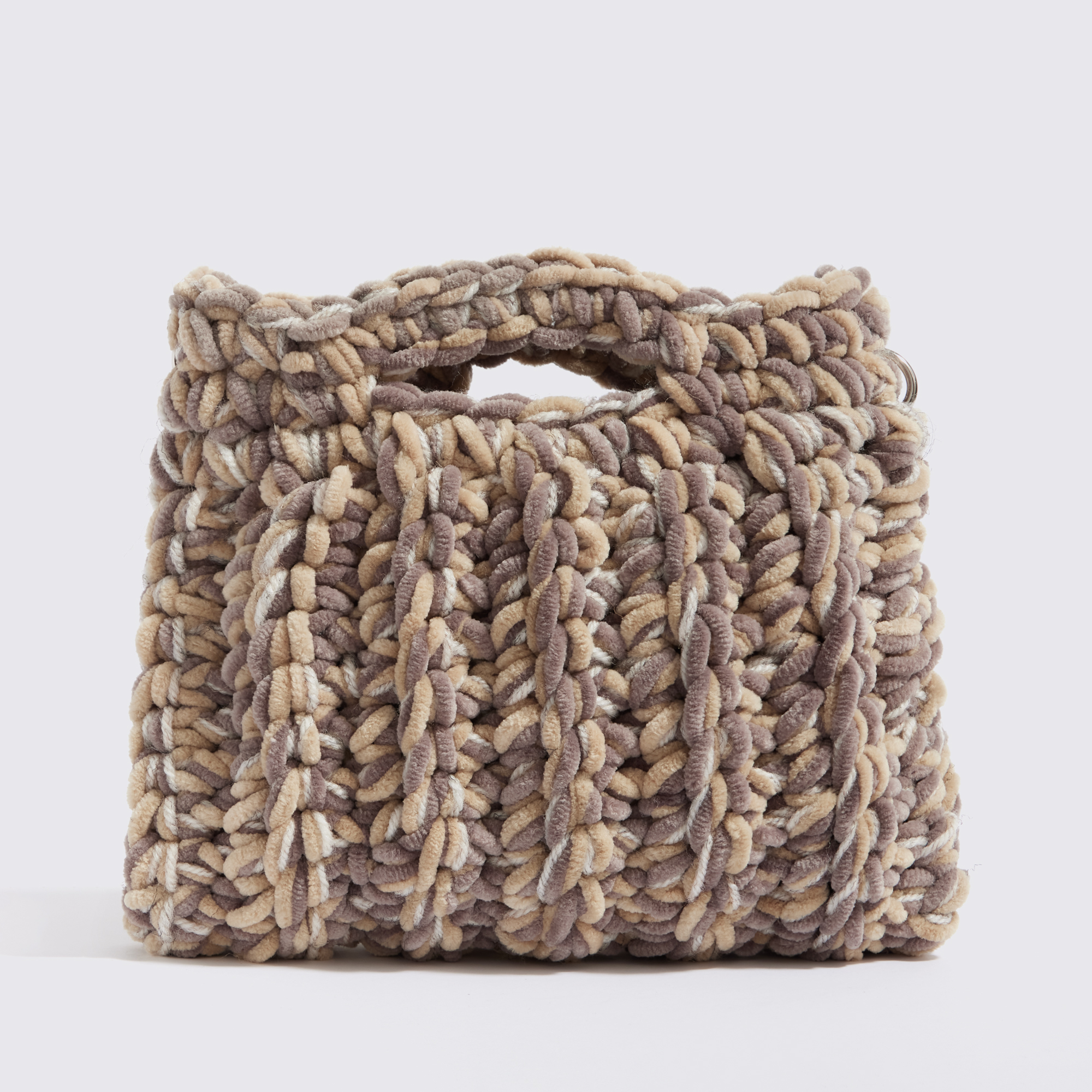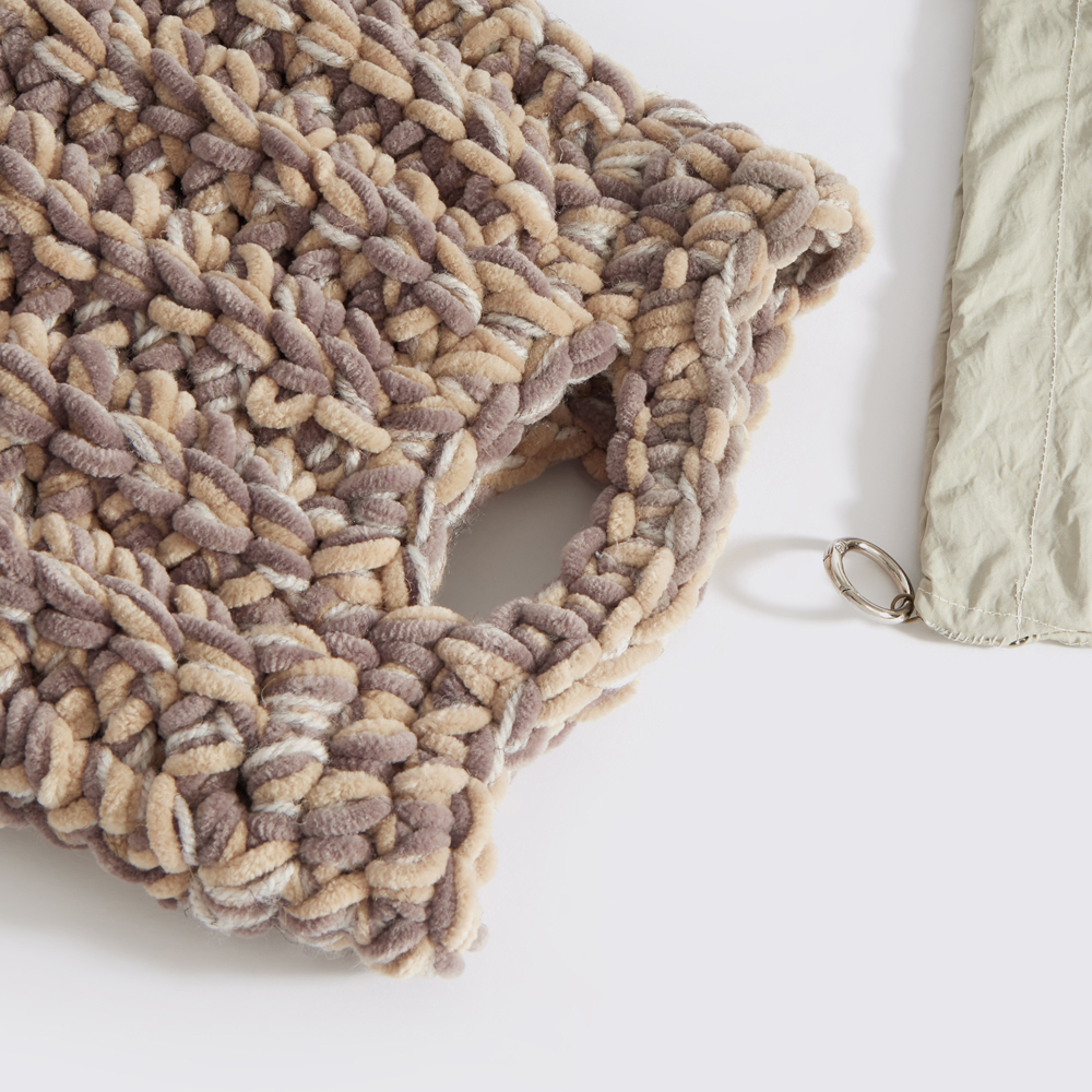 Made from fluffy velour it has a slouchy trapeze shape, made with tight knots creating its ribbed effect. Use the waterproof pouch for your cards, keys and lipstick.