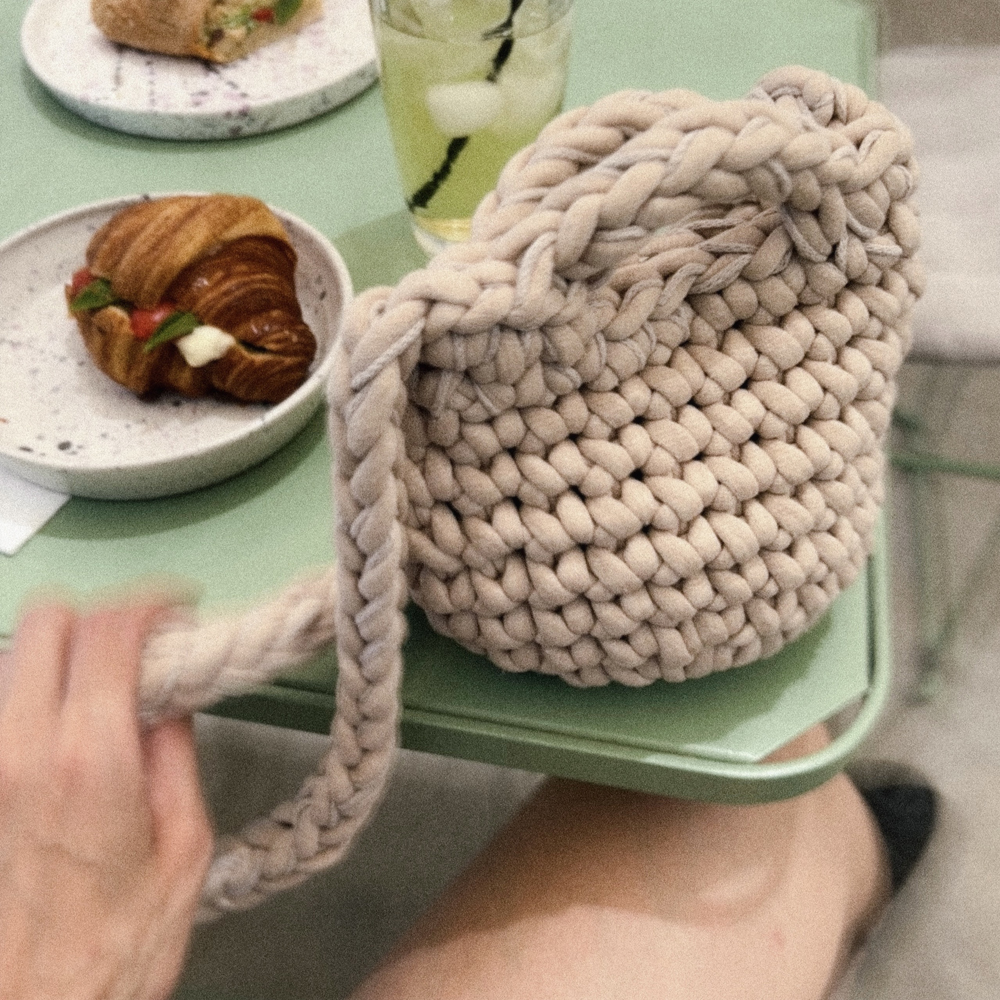 This teardrop clutch is crafted in Athens from squashy cotton yarn in 10 colour options. The unlined interior has enough space for your cardholder, keys and phone. Use the long strap to drape it cross-body.