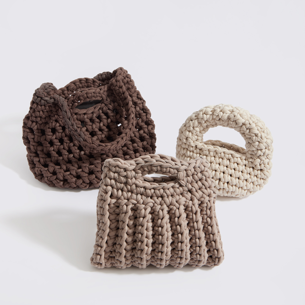 Our signature squashy yarn in new handbag and tote shapes.